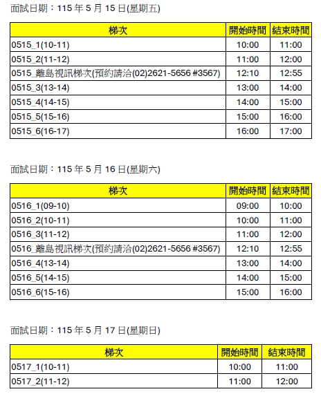 此階段僅提供可預約面試時段參考,面試梯次分配如下:(★每梯次面試時間約60分鐘,請於面試梯次開始前20分鐘辦理報到)